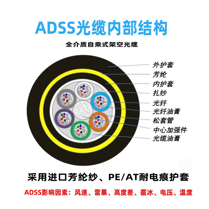 型號結構分解典型的ADSS自承式光纜型號如"ADSS-24B1-100-PE",各部分含義如下: ADSS:產品類型標識,代表全介質自承式光纜 24:光纖芯數,表示光纜內含24根光纖 B1:光纖類型,此處為G.652D單模光纖(單模多模均可) &nbs